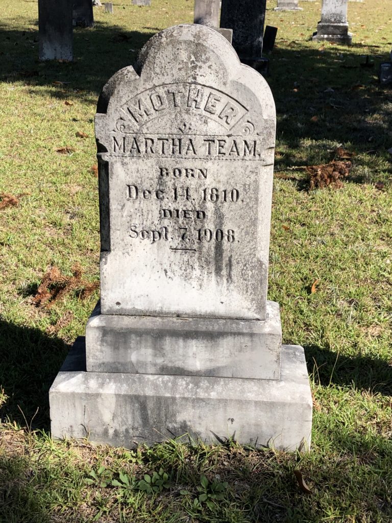 Martha Team was counted in the census on 12 Aug 1870 in Wateree, Kershaw, South Carolina, USA, as a 60 year old female, white. Also in the home, James Team, Benjamin Team and Martha Team.