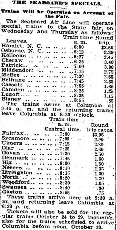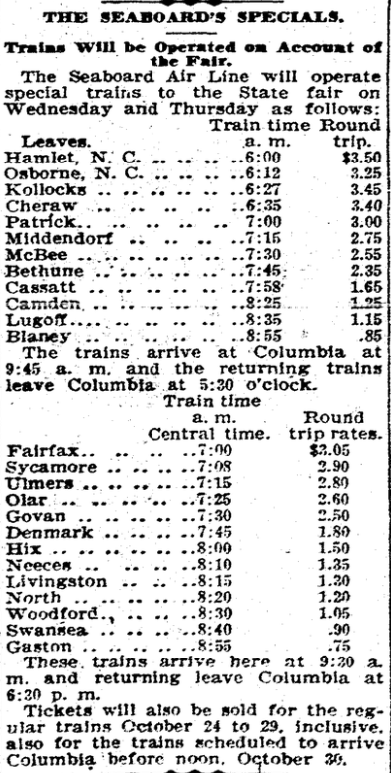Trains will be Operated on Account of the Fair. The Seaboard Air Line will operate special trains to the State fair on Wednesday and Thursday as follows: Leaves Train Time a.m. Round Trip Hamlet, N. C. . . . . . . . . . . . . . . . . 6:00 $3.50 Osborne, N. C. . . . . . . . . … Continue reading The Seaboard’s Specials