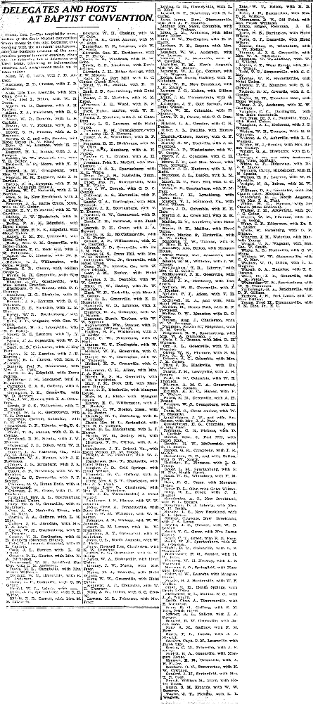 Union, Dec. 7. – The hospitality committee of the State Baptist convention which meets in this city, beginning this evening with the ministers’ conference, and the business sessions of the convention proper tomorrow evening, gives out the following list of delegates and their hosts, according to information received and assignments made up to noon today;