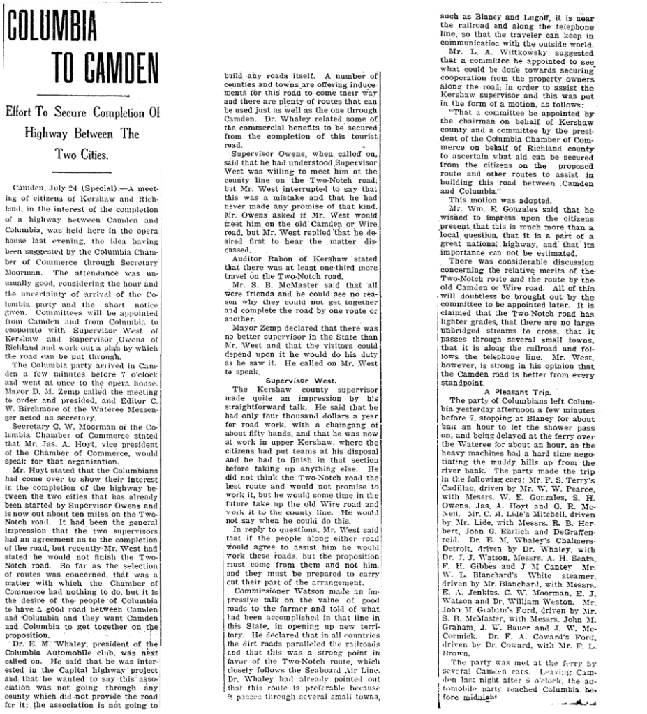 Camden, July 24 (Special) – A meeting of citizens of Kershaw and Richland, in the interest of the completion of a highway between Camden and Columbia, was held here in the opera house last evening, the ideal having been suggested by the Columbia Chamber of Commerce through Secretary Moorman. The attendance was unusually good, considering the hour and the uncertainty of arrival of the Columbia party and the short notice given. Committees will be appointed from Camden and from Columbia to cooperate with Supervisor Owens of Richland and work out a plan by which the road can be put through.
