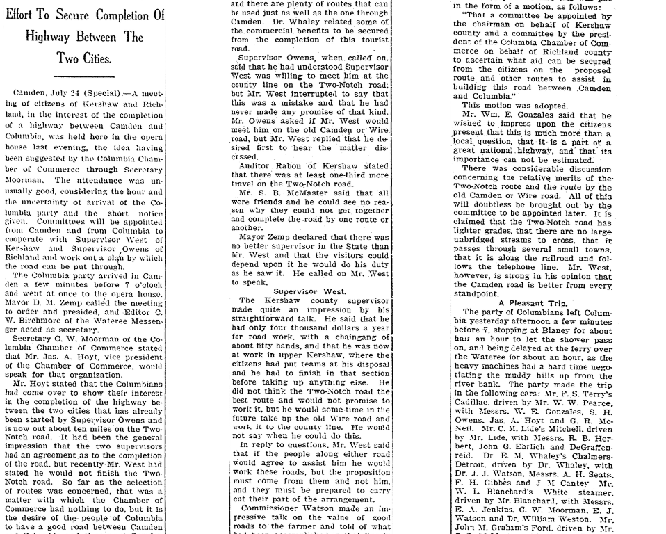 Camden, July 24 (Special) – A meeting of citizens of Kershaw and Richland, in the interest of the completion of a highway between Camden and Columbia, was held here in the opera house last evening, the ideal having been suggested by the Columbia Chamber of Commerce through Secretary Moorman. The attendance was unusually good, considering the hour and the uncertainty of arrival of the Columbia party and the short notice given. Committees will be appointed from Camden and from Columbia to cooperate with Supervisor Owens of Richland and work out a plan by which the road can be put through.
