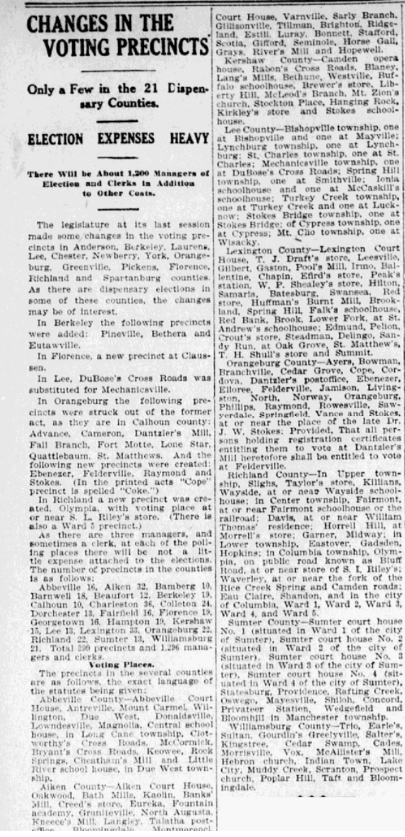 In Orangeburg the following precincts were struck out of the former act, as they are in Calhoun county: Advance, Cameron, Dantzier’s Mill, Fall Branch, Fort Motte, Lone Star, Quattlebaum, St. Matthews. And the following new prcincts were created: Ebenezer, Felderville, Raymond and Stokes. (In the printed acts “Cope” precinct is spelled “Coke.”)