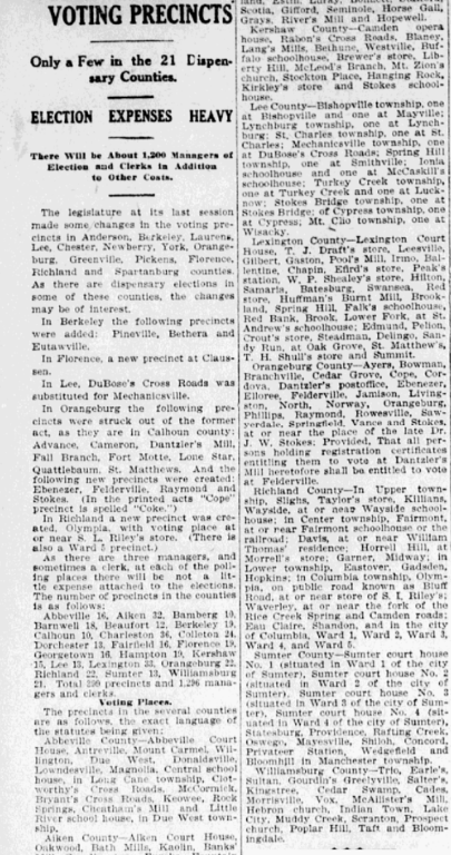 In Orangeburg the following precincts were struck out of the former act, as they are in Calhoun county: Advance, Cameron, Dantzier’s Mill, Fall Branch, Fort Motte, Lone Star, Quattlebaum, St. Matthews. And the following new prcincts were created: Ebenezer, Felderville, Raymond and Stokes. (In the printed acts “Cope” precinct is spelled “Coke.”)