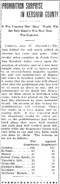 It Was Expected That “Drys” Would Win But Their Majority Was More Than Was Expected. Camden, Aug. 17. (Special) – The long looked for and much talked of election has come and gone. Like twenty other counties in South Carolina Kershaw today voted upon the question of whiskey and at a late hour tonight signs as well as figures points to an overwhelming majority against … Continue reading Prohibition Surprise In Kershaw County