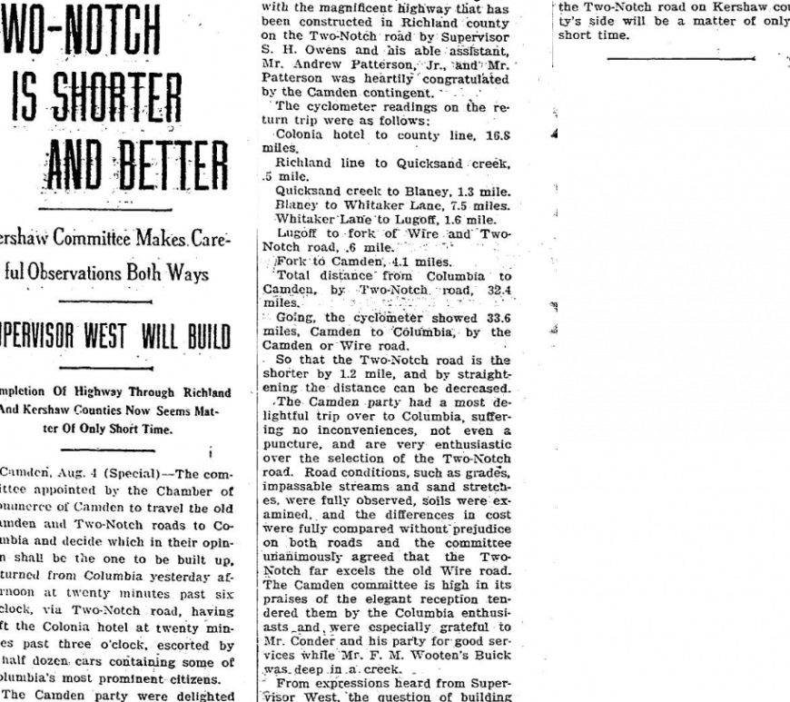 Kershaw Committee Make Careful Observation Both Ways Supervisor West Will Build Completion Of Highway Through Richland And Kershaw Counties Now Seems Matter Of Only Short Time Camden, Aug. 4 (Special) – The committee appointed by the Chamber of Commerce of Camden to travel the old Camden and Two-Notch roads to Columbia and decide which in their opinion shall be the one to be built up, … Continue reading Two-Notch is Shorter and Better