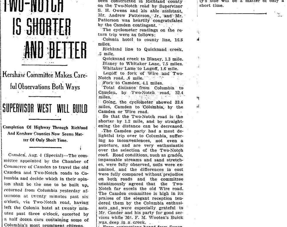 Camden, Aug. 4 (Special) – The committee appointed by the Chamber of Commerce of Camden to travel the old Camden and Two-Notch roads to Columbia and decide which in their opinion shall be the one to be built up, returned from Columbia yesterday afternoon at twenty minutes past six o’clock, via Two-Notch road, having left the the Colonia hotel at twenty minutes past three o’clock, escorted by a half dozen cars containing some of Columbia’s most prominent citizens.