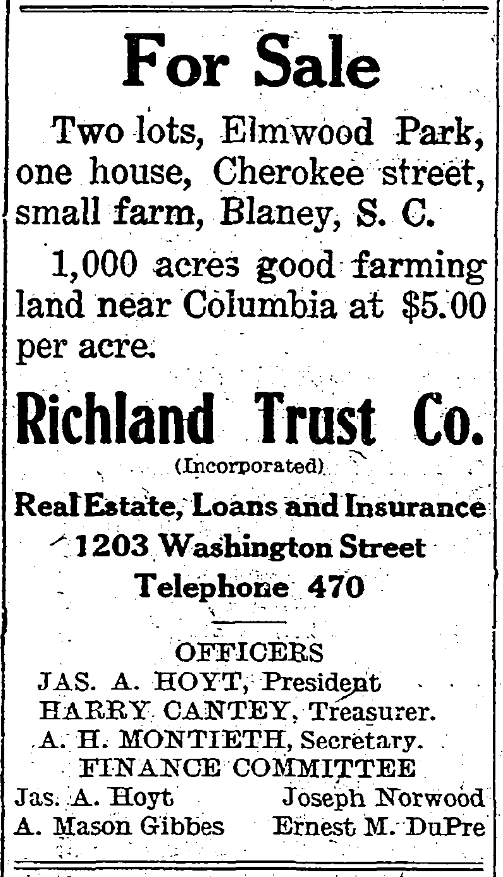 Two lots, Elmwood Park, one house, Cherokee street, small farm, Blaney, S. C.