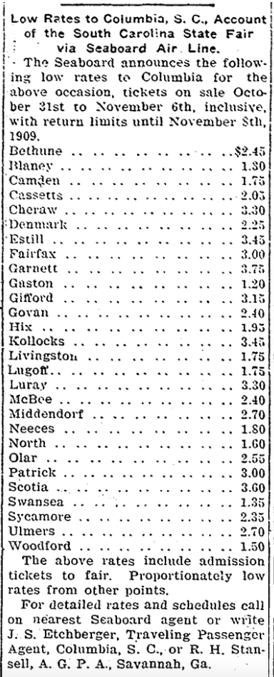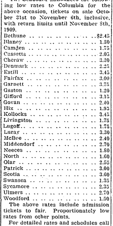 The Seaboard announces the following low rates to Columbia for the above occasion, tickets on sale October 31st to November 6th, inclusive, with return limits until November 8th, 1909