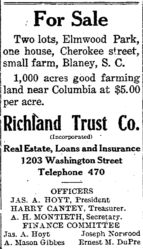 Two lots, Elmwood Park, one house, Cherokee street, small farm, Blaney, S. C.