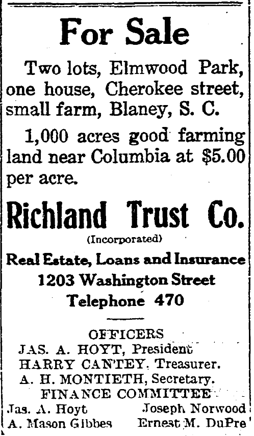 Two lots, Elmwood Park, one house, Cherokee street, small farm, Blaney, S. C.