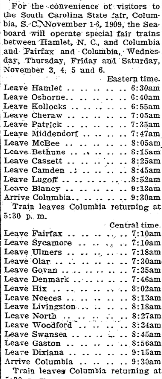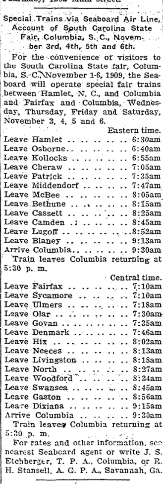 For the convenience of visitors to the South Carolina State fair, Columbia, South Carolina, November 1-6,1909, the Seaboard will operate special fair trains between Hamlet, North Carolina, and Columbia and Fairfax and Columbia, Wednesday, Thursday, Friday and Saturday, November 3, 4, 5 and 6.