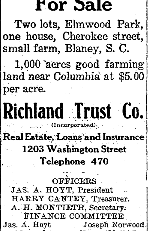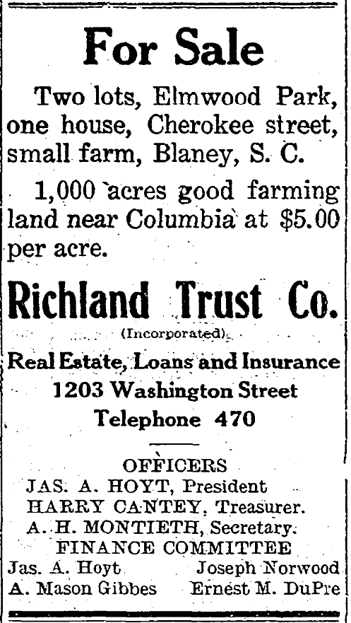 Two lots, Elmwood Park, one house, Cherokee street, small farm, Blaney, S. C.