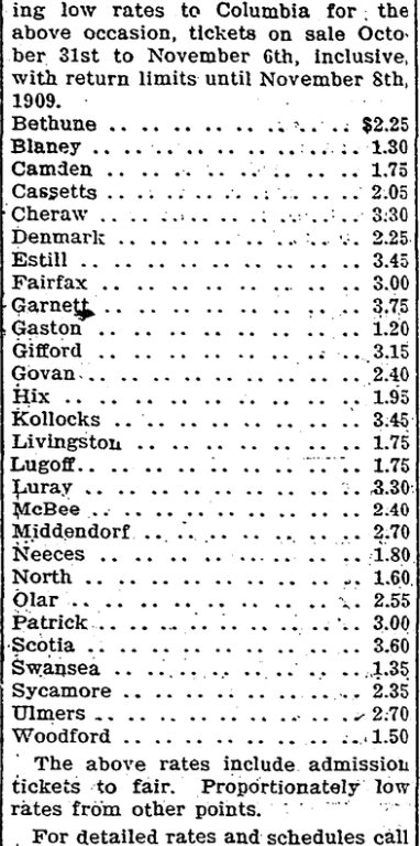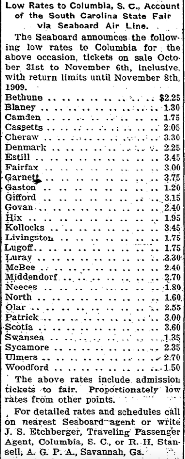 The Seaboard announces the following low rates to Columbia for the above occasion, tickets on sale October 31st to November 6th, inclusive, with return limits until November 8th, 1909