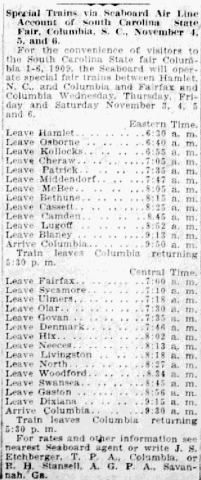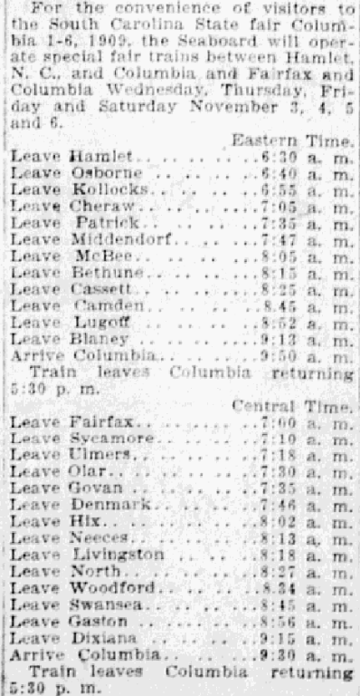 For the convenience of visitors to the South Carolina State fair, Columbia, South Carolina, November 1-6,1909, the Seaboard will operate special fair trains between Hamlet, North Carolina, and Columbia and Fairfax and Columbia, Wednesday, Thursday, Friday and Saturday, November 3, 4, 5 and 6.