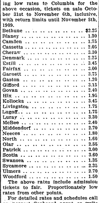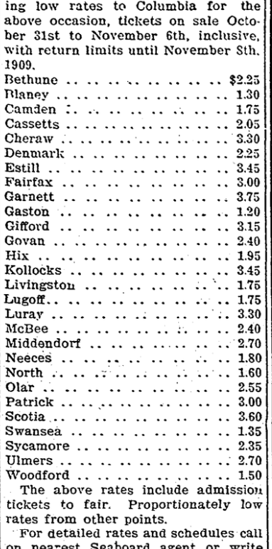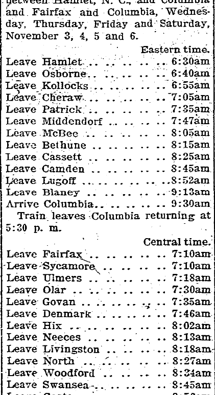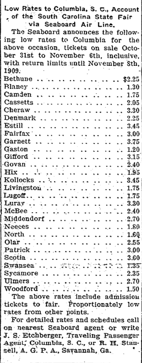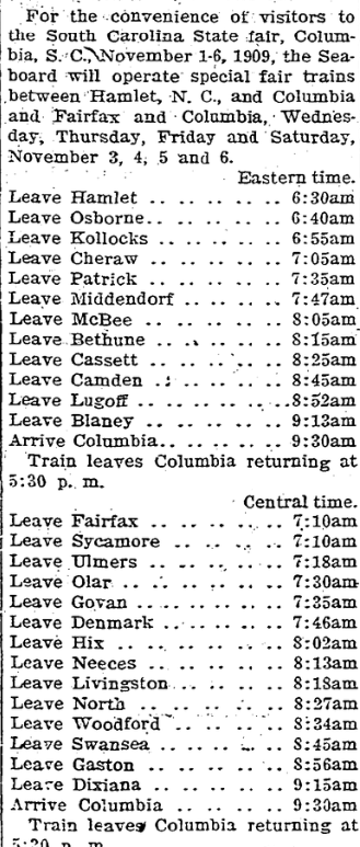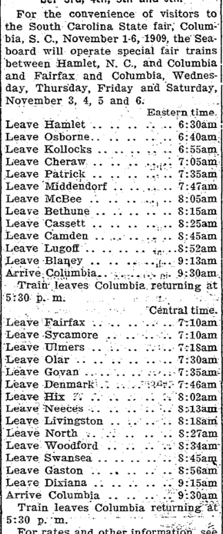 For the convenience of visitors to the South Carolina State fair, Columbia, South Carolina, November 1-6,1909, the Seaboard will operate special fair trains between Hamlet, North Carolina, and Columbia and Fairfax and Columbia, Wednesday, Thursday, Friday and Saturday, November 3, 4, 5 and 6. Eastern Time. Leave Hamlet. . . . . . . . . . . . . . . . 6:30am Leave … Continue reading Special Trains via Seaboard Air Line, Account of the South Carolina State Fair, Columbia, S. C., November 3rd, 4th, 5th and 6th.