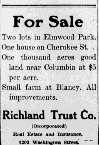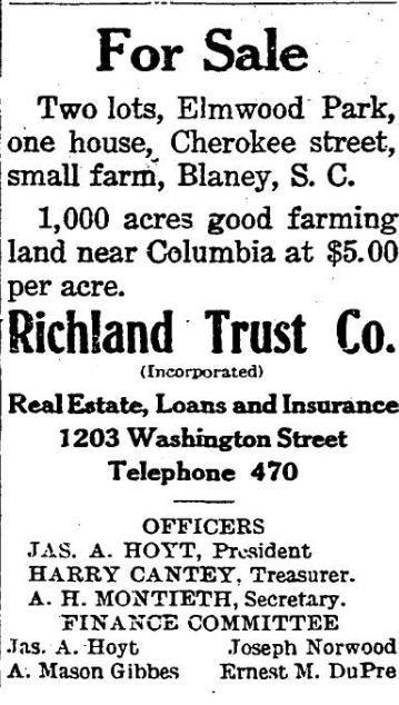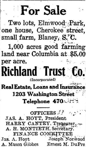 Two lots, Elmwood Park, one house, Cherokee street, small farm, Blaney, S. C. 1,000 acres good farming land near Columbia at $5.00 per acre. Richland Trust Co. (Incorporated) Real Estate, Loans and Insurance1203 Washington StreetTelephone 470 OFFICERSJAS. A. HOYT, PresidentHARRY CANTEY, Treasurer.A. H. MONTIETH, Secretary. FINANCE COMMITTEEJas. A. Hoyt. Joseph NorwoodA. Mason Gibbes Ernest M. DuPre Continue reading For Sale