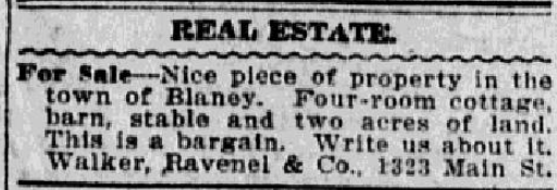 For Sale – Nice piece of property in the town of Blaney. Four-room cottage, barn, stable and two acres of land. This is a bargain. Write us about it. Walker, Ravenel & Co., 1323 Main St. Continue reading Real Estate