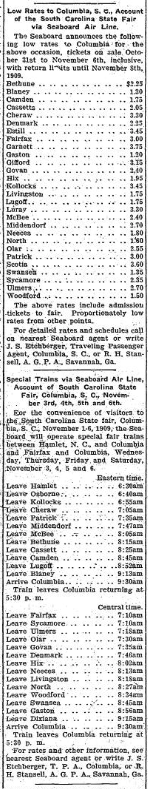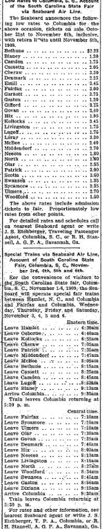 For the convenience of visitors to the South Carolina State fair, Columbia, South Carolina, November 1-6,1909, the Seaboard will operate special fair trains between Hamlet, North Carolina, and Columbia and Fairfax and Columbia, Wednesday, Thursday, Friday and Saturday, November 3, 4, 5 and 6.