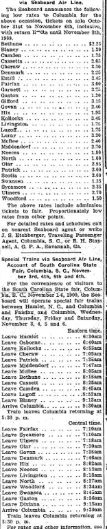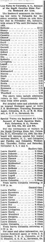 For the convenience of visitors to the South Carolina State fair, Columbia, South Carolina, November 1-6,1909, the Seaboard will operate special fair trains between Hamlet, North Carolina, and Columbia and Fairfax and Columbia, Wednesday, Thursday, Friday and Saturday, November 3, 4, 5 and 6.