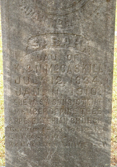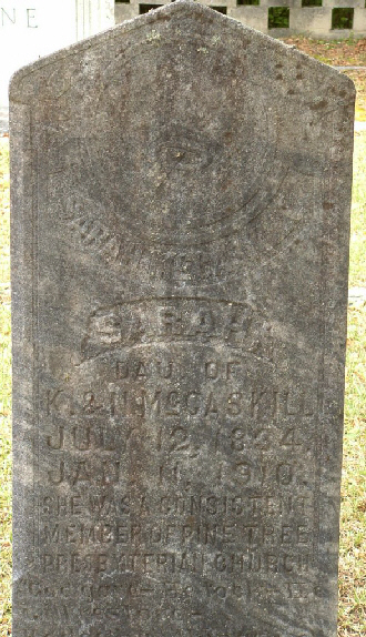 Sarah McCaskill was born on 12 Jul 1834 in South Carolina, USA a child of Kenneth McCaskill and Nancy McLeod McCaskill.