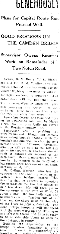 Supervisor west is pushing the work on his end. Blaney and Camden have raised enough money, with Columbia’s contribution, to clay the road across the town of Blaney. Particular attention will be paid to the hill just above Blaney, which has been the despair of autoists on account of the deep sand. Many a motorist from Columbia who wanted to go to Camden has turned back because of that heartbreaking sandy hill.