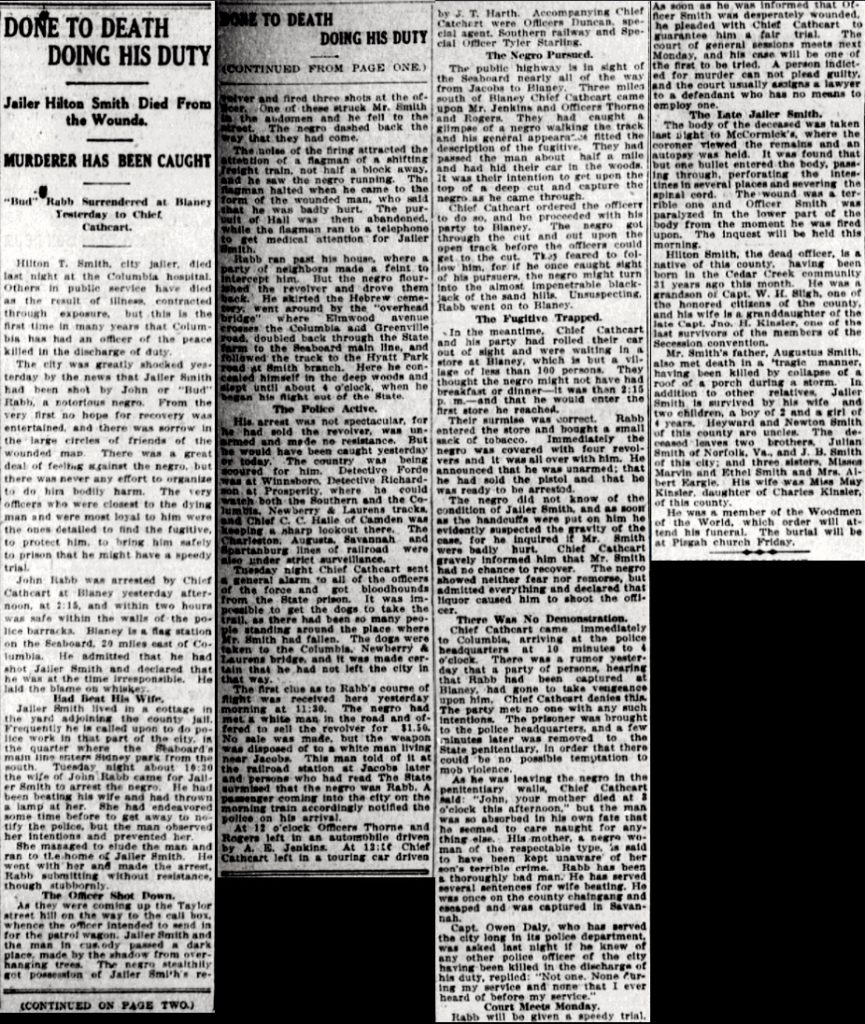 The first clue as to Rabb’s course of flight was received here yesterday morning at 11:30. The negro had met a white man in the road and offered to sell the revolver for $1.50. No sale was made, but the weapon was disposed of to a white man living near Jacobs. This man told of it at the railroad station at Jacobs later and the persons who had read The State summoned that the negro was Rabb. A passenger coming into the city on the morning train accordingly notified the police on his arrival.
