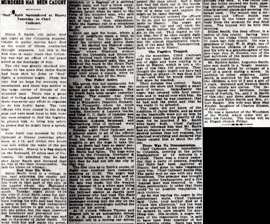 John Rabb was arrested by chief Cathcart at Blaney yesterday afternoon, at 2:15, and within two hours was safe within the walls of the police barracks. Blaney is a flag station on the Seaboard, 20 miles east of Columbia. He admitted that he had shot, Jailer Smith and declared that he was at the time irresponsible. He laid the blame on whiskey.