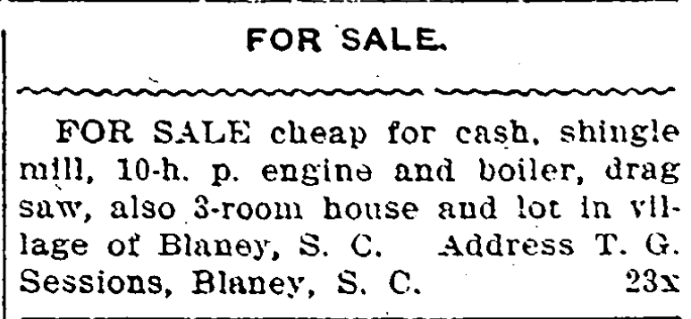 FOR SALE cheap for cash, shingle mill, 10-h. p. engine and boiler, drag saw, also 3-room house and lot in village of Blaney, S. C. Address T. G. Sessions, Blaney, S. C.
