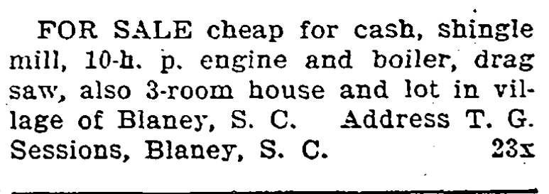 FOR SALE cheap for cash, shingle mill, 10-h. p. engine and boiler, drag saw, also 3-room house and lot in village of Blaney, S. C. Address T. G. Sessions, Blaney, S. C.