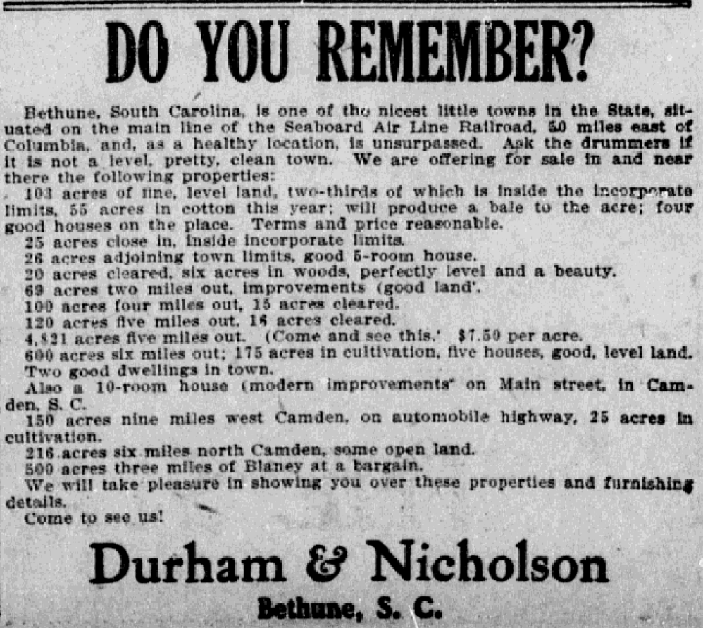 Bethune, South Carolina, is one of the nicest little towns in the State, situated on the main line of the Seaboard Air Line Railroad, 50 miles east of Columbia, and, as a healthy location, is unsurpassed. Ask the drummers if it is not a level, pretty, clean town. We are offering for sale in and near there there following properties: