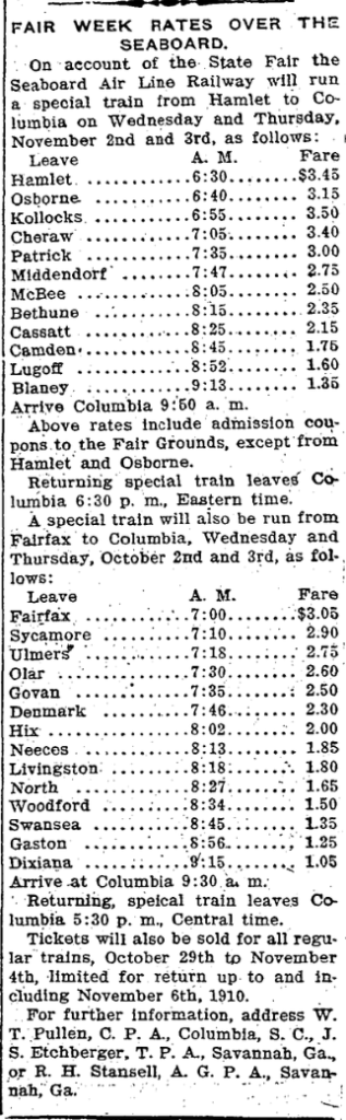 On account of the State Fair the Seaboard Air Line Railway will run a special train from Hamlet to Columbia on Wednesday and Thursday, November 2nd and 3rd, as follows: