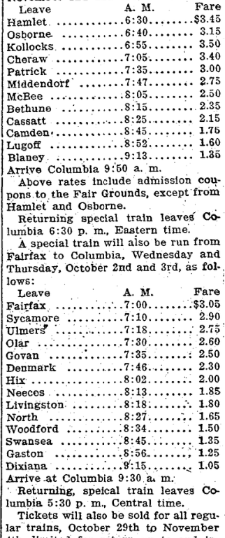 A special train will also be run from Fairfax to Columbia, Wednesday and Thursday, October 2nd and 3rd, as follows;
