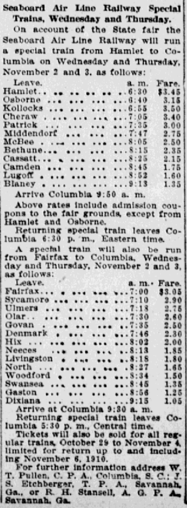 On account of the State Fair the Seaboard Air Line Railway will run a special train from Hamlet to Columbia on Wednesday and Thursday, November 2nd and 3rd, as follows: