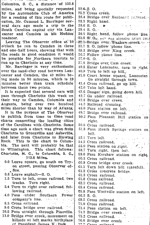 Having received a number of calls for a road chart from Charlotte to Columbia, S. C., a distance of 133.8 miles, and being specially requested by the Automobile club of America for a reading of this route for publication, Mr. Osmond L. Barriger several days ago made a trip to the South Carolina capital city via Lancaster and Camden in his Hudson roadster.
