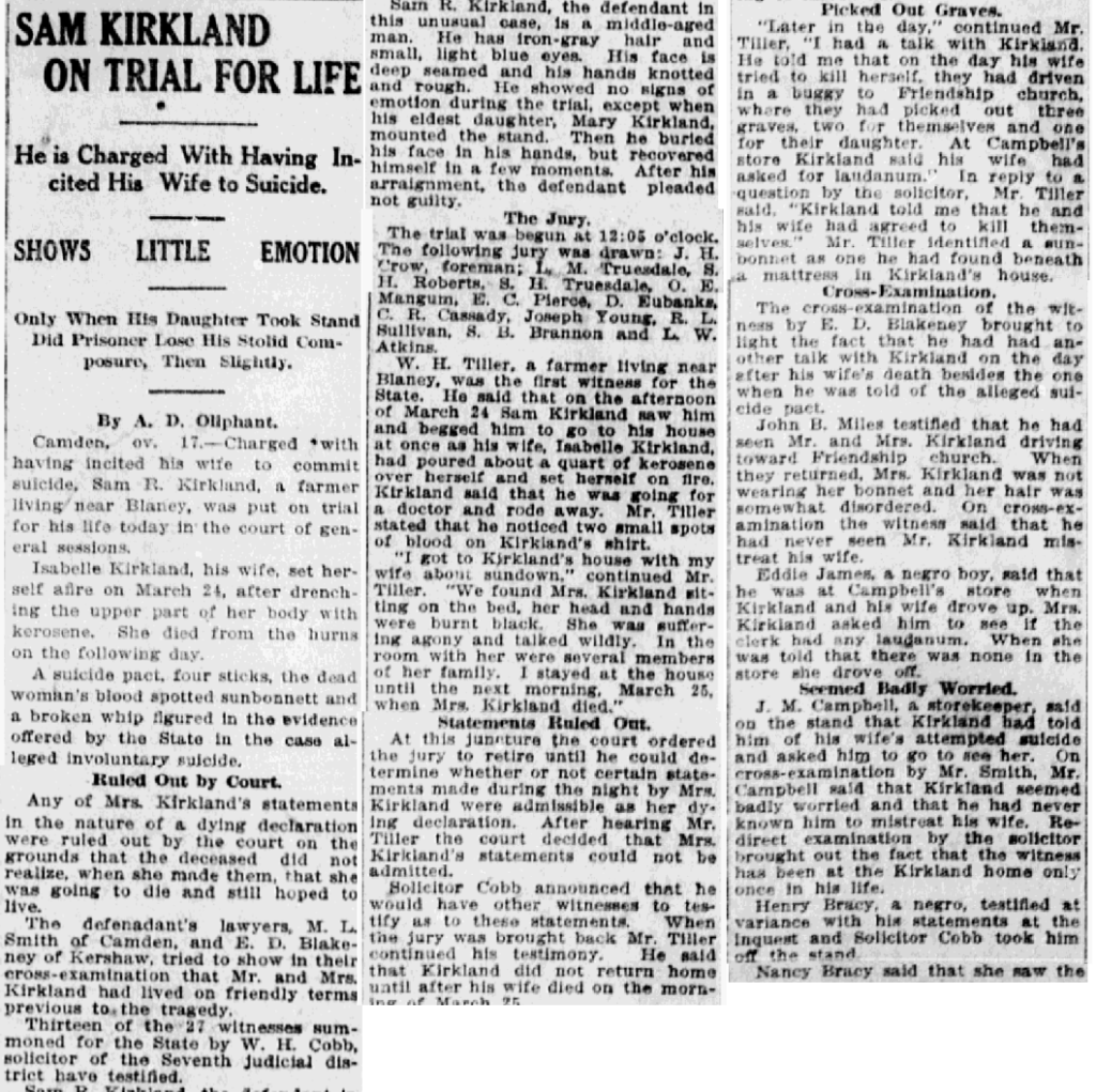 W. H. Tiller, a farmer living near Blaney, was the first witness for the State. He said that on the afternoon of March 24. Sam Kirkland saw him and begged him to go to his house at once as his wife, Isabelle Kirkland, had poured about a quart of Kerosene over herself and set herself on fire, Kirkland said that he was going for a doctor and rode away. Mr. Tiller stated that he noticed two small spots of blood on Kirkland’s shirt.