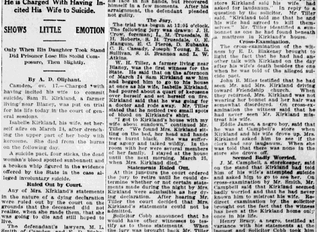 Camden, Nov. 17. – Charged with having incited his wife to commit suicide, Sam R. Kirkland, a farmer living near Blaney, was put on trial for his life today in the court of general sessions.