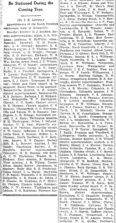 Beaufort district: D. J. Sanders, district superintendent; Aiken, S. D. Williams; Appleton, W. McWillie; Allen-Romans; Barnwell, W. M. Steele; dale, A. R. Howard; Beaufort, R. E. Bamberg station, J. B. Thomas; Bamberg circuit, A. M. Wright; Cottageville, M. O. Stewart; Ehrhardt, W. G. White; Grahamville and Hardeeville, Wm. David; Green Pond, J. T. Wilson; Hampton, W. M. Stoney; Jacksonboro, J. L. Chestnut; Lodge, G. W. Gantt; Ruffin, S. A. Funches; Springtown, J. T. Latson; Seiglingville, Moses Mason; Walterboro, E. W. Stratton; Ulmers, E. J. Curry; Yemassee, E. Forrest; Malet and Cook chapel, to be supplied; Rocky Point, to be supplied; Bennettsville district, A. C. Asbury, district superintendent; Bennettsville, B. S. Jackson; Bethune, I. H. Richardson; Bishopville, R. F. Harrington; Cheraw, C. C. Scott; Cheraw circuit, D. E. Thomas; Cheraw mission, C. B. Gleaves; Chesterfield, C. C. Robinson; Clio and Tatum, W. B. Romans; Darlington, L. G. Greggs; Darlington Circuit, J. A. Gary; Darlington mission, E. M. Washington; Dillon, J. McLeod; Dunbar, W. S. Neal; Hartsville station, J. M. Phillips; Hartsville circuit, F. W. Vance; Jefferson, J. R. Graham; Little Rock, S. Greene; McBee, L. A. Thomas; North Marlboro, B. C. Jackson; Spears, B. S. Cooper; Society Hill, R, L. Brower; Smyrna, J. McEaddy; Charleston district, J. W. Moultrie, district superintendent; Centenary, M. M. Mouzon; Old Bethel, C. H. Harleston; Wesley, R. L. Hickson; East mission, S. Bonneau, West mission, J. H. Wilson; Cooper River, Daniel Brown; Dorchester, M. Stewart; Holly Hill, B. G. Frederick; Johns Island, I. L. Hardy; Maryville, F. D. Smith; Pinopolis, J. S. McMillen; Ridgeville, A. R. Smith; St. Johns, J. F. Freene; St. Stephens, G. F. Miller; St. Thomas, Thomas Judge; Summerville, N. W. Greene; Washington and Ladson, T. G. Robinson; Florence district, I. H. Fulton, district superintendent; Black River, J. F. Martin; Brookgreene, A. D. Jackson; Cades, D. Salters; Florence, W. S. Thompson; Georgetown, T. J. Robinson; Greeleyville, W. B. Bowers; Kingstree, G. J. Davis; Kingstree circuit, J. P. Robinson; Lake City, Wiley Littlejohn; Lanes, C. B. Lowery; Latta, York Goodlett; Marion, A. S. J. Brown; Mars Bluff, W. M. Eaddy; Mullins, J. F. Wood; McClellansville, J. A. Noris; Rosemary and Pleasant Grove, J. A. Gibson; Salem and Wesley, J. A. Harroll; St. Mary’s, Benj. Brown; St. Luke, C. H. Hood; St. Paul and Waccamaw, G. W. Rodgers; Springville, M. Wilson; Timmonsville, J. L. Grice; Turkey Creek, N. T. Bowen, Jr.; Greenville District, J. F. Page, district superintendent; Abbeville and Lowndesville, S. E. Watson; Anderson, A. G. Kenedy; Belton, T. C. Frazier; Easley, L. L. Thomas; East Anderson, W. G. Deas; East Greenville, S. M. McCullum; Greenville Station, W. G. Valentine; Liberty, J. C. Martin; North Greenville, J. A. Curry; Pendleton and Central, Alfred Lewis; Pickens, J. C. Gibbes; Rock Hill. L. W. Williams; Seneca, B. S. A. Williams; South Greenville, C. L. Logan; St. Mark, H. W. William; Townsville, Lawrence Rice; Westminster and Walballa, J. E. C Jenkins; West Anderson, W. F. Smith: Williamston, J. A. Brown; Sterling College, D. M. Minus; Orangeburg district, E. B. Burroughs, District superintendent; Bradham mission W. C. Summers; Branchville, A. B. Murphy; Columbia, A. S. Cottingham; Columbia mission, J. H. Johnson; Denmark, V. S. Johnson; Edisto Forks, J. S. Thomas; Jamison, I. E. Lowery, postoffice Columbia; Lexington, G. W. Williams; Macedonia, S. J. Cooper; Midway, J. S. Tyler; North, J. D. Mitchell; Neeces and Norway, R. H. Cunningham; Orangeburg, A. E. Quick; Orangeburg circuit, J. L. Henderson; Pineville, N. T. Bowen, Sr.; Rowesville, A. G. Townsend; Reevesville, H. H. Cooper; St. George, J. B. Taylor; Springfield, W. J. Smith; Swansea and Woodford, G. Livingston; Claflin university, L. M. Dunton; Sumter district, J. E. Wilson, district superintendent; Antioch, A. D. Brown; Blaney, J. A. Murray; Borden, James Richards; Camden, R. A. Cottingham; Camden circuit, J. C. Burch; Lamar, S. S. Sparks; Lynchburg, Isaac Myers, Longtown, A. H. Hayes; Mayesville, W. H. Redfield; Mechanicsville, G. W. Moore; Mount Zion, R. A. Thomas; Rock Springs, G. B. Tillman; Shiloh, C. H. Dangerfield; St. Matthews, T. W. Williams; Sumter, W. M. Hanna; Sumter Circuit, P. R. Camlin; Sumter mission, B. J. McDaniel; Wateree, W. H. Jones; Field agent Sunday school board, C. C. Jacobs; Spartanburg district, C. R. Brown, district superintendent; Blacksburg, C. C. Campbell; Bradley, H. H. Matthews; Campobello, W. M. Smith; Chester, J. I. Miller; Clover, J. B. Middleton; Cowpens, D. H. Kearse; East Spartanburg and Chenie circuit, A. D. Harris; Gaffney station, R. F. Freeman; Greenwood, J. A. Glenn; Greers, E. W. Adams; McConnellsville, W. M. Griffin; Newberry and Trinity, Frank Quick; Ninety-Six, J. W. Groves; Pacolet, C. C. Clarke; Reidville, T. E. McLaughlin; Rock Hill, D. P. Murphy; Spartanburg, G. W. Cooper; Spartanburg circuit, S. A. King; Spartanburg Mission, C. B. Brown; St. James, A. H. Fuller; Union and Jonesville, H. J. Kirk; Wellford, W. T. Kelly; Wilkinsville, J. A. Summers; Yorkville, N. S. Smith; York Circuit, J. C. Armstrong; Laurens mission, M. F. Butler.