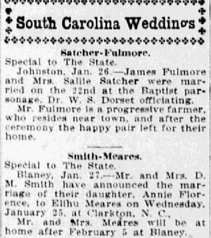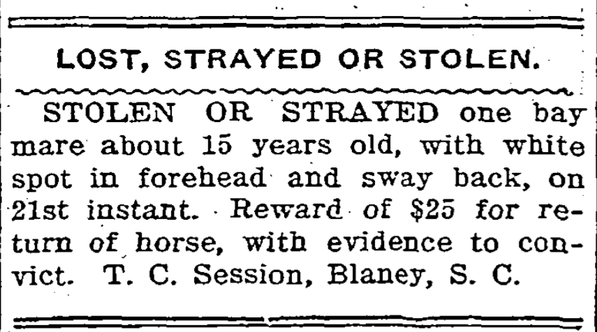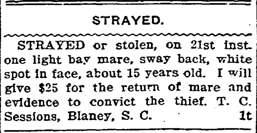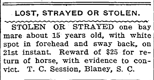 Stolen Or Strayed, one bay mare about 15 years old, with white spot in forehead and sway back, on 21st instant. Reward of $25 for the return of horse, with evidence to convict. T. C. Sessions, Blaney, S. C. Continue reading Stolen Or Strayed