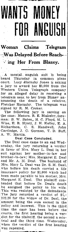 Woman Claims Telegram Was Delayed Before Reaching Her From Blaney. A Mental anguish suit is being heard Thursday in common pleas court. Lucy Hornsby Jones is asking a jury to award her $1,000 from the Western Union Telegraph company for an alleged delay in receiving a telegram sent to her from Blaney annoucing the death of a relative, Fletcher Hornsby. The telegram was signed by … Continue reading Wants Money For Anguish