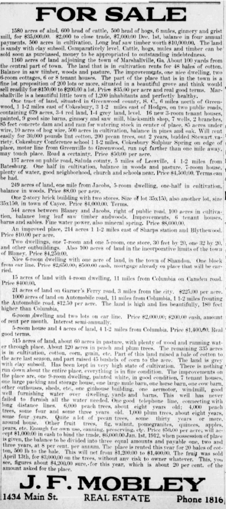 1160 acres of land adjoining the town of Marshville, Ga. About 100 yards from the central part of town. The land that is in cultivation rents for 48 bales of cotton. Balance in saw timber, woods and pasture. The improvements, one nice dwelling, two 6-room cottages, 6 or 8 tenant houses. The part of the place that is in the town is a fine lot proposition of 200 lots or more, situated in a beautiful grove and think would sell readily for $150.00 to $200.00 a lot. Price $35.00 per acre and real good terms. Marshallville is a beautiful little town of 1,2000 inhabitants and perfectly healthy.