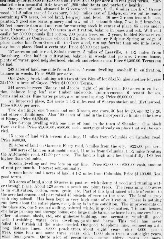 21 acres of land on Garner’s Ferry road, 3 miles from the city, $225.00 per acre.
