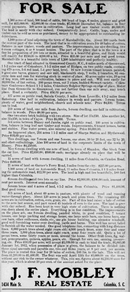 21 acres of land on Garner’s Ferry road, 3 miles from the city, $225.00 per acre.