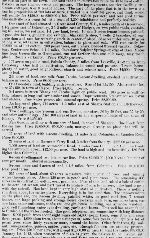 21 acres of land on Garner’s Ferry road, 3 miles from the city, $225.00 per acre.