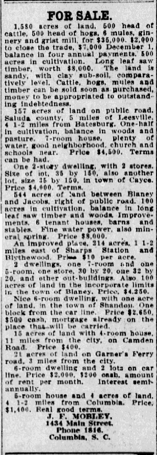 544 acres of land between Blaney and Jacobs, right of public road. 100 acres in cultivation, balance long leaf saw timber and woods. Improvements, 6 tenant houses, barns and sables. Fine water power, also mineral spring. Price $8,000.00.