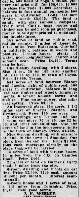 544 acres of land between Blaney and Jacobs, right of public road. 100 acres in cultivation, balance long leaf saw timber and woods. Improvements, 6 tenant houses, barns and sables. Fine water power, also mineral spring. Price $8,000.00.