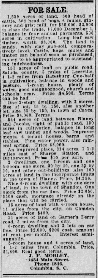 544 acres of land between Blaney and Jacobs, right of public road. 100 acres in cultivation, balance long leaf saw timber and woods. Improvements, 6 tenant houses, barns and sables. Fine water power, also mineral spring. Price $8,000.00.