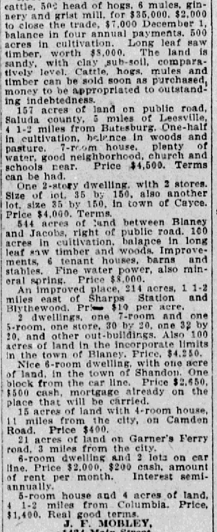 544 acres of land between Blaney and Jacobs, right of public road. 100 acres in cultivation, balance long leaf saw timber and woods. Improvements, 6 tenant houses, barns and sables. Fine water power, also mineral spring. Price $8,000.00.