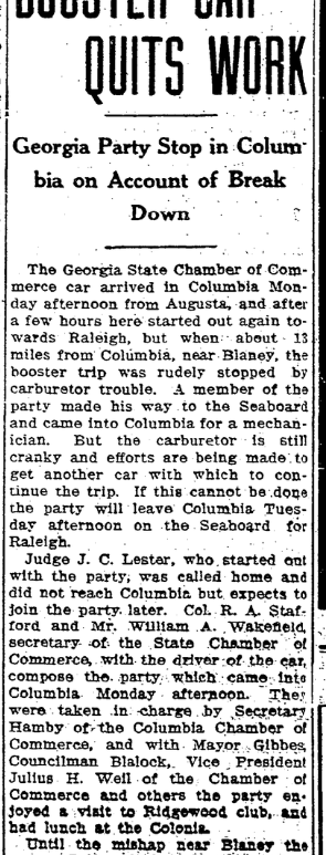 Georgia Party Stop in Columbia on Account of Break Down The Georgia State Chamber of Commerce car arrived in Columbia Monday afternoon from Augusta, and after a few hours here started out again towards Raleigh, but when about 13 miles from Columbia, near Blaney, the booster trip was rudely stopped by carburetor trouble. A member of the party made his way to the Seaboard and … Continue reading Booster Car Quits Work
