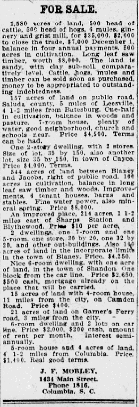 544 acres of land between Blaney and Jacobs, right of public road. 100 acres in cultivation, balance long leaf saw timber and woods. Improvements, 6 tenant houses, barns and sables. Fine water power, also mineral spring. Price $8,000.00.