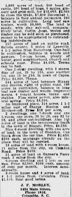 544 acres of land between Blaney and Jacobs, right of public road. 100 acres in cultivation, balance long leaf saw timber and woods. Improvements, 6 tenant houses, barns and sables. Fine water power, also mineral spring. Price $8,000.00.